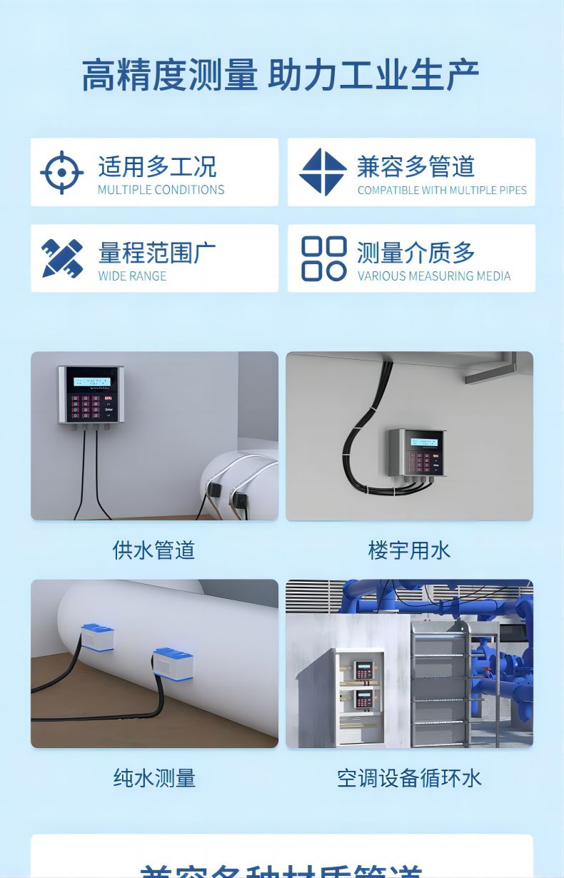 產品描述:聯測超聲波流量計適合相對純凈液體流量的管外測量,尤其是在水流量測量、在工業循環水、空調制冷循環水、原水、高壓水、自來水,污水排放管等廣泛應用。