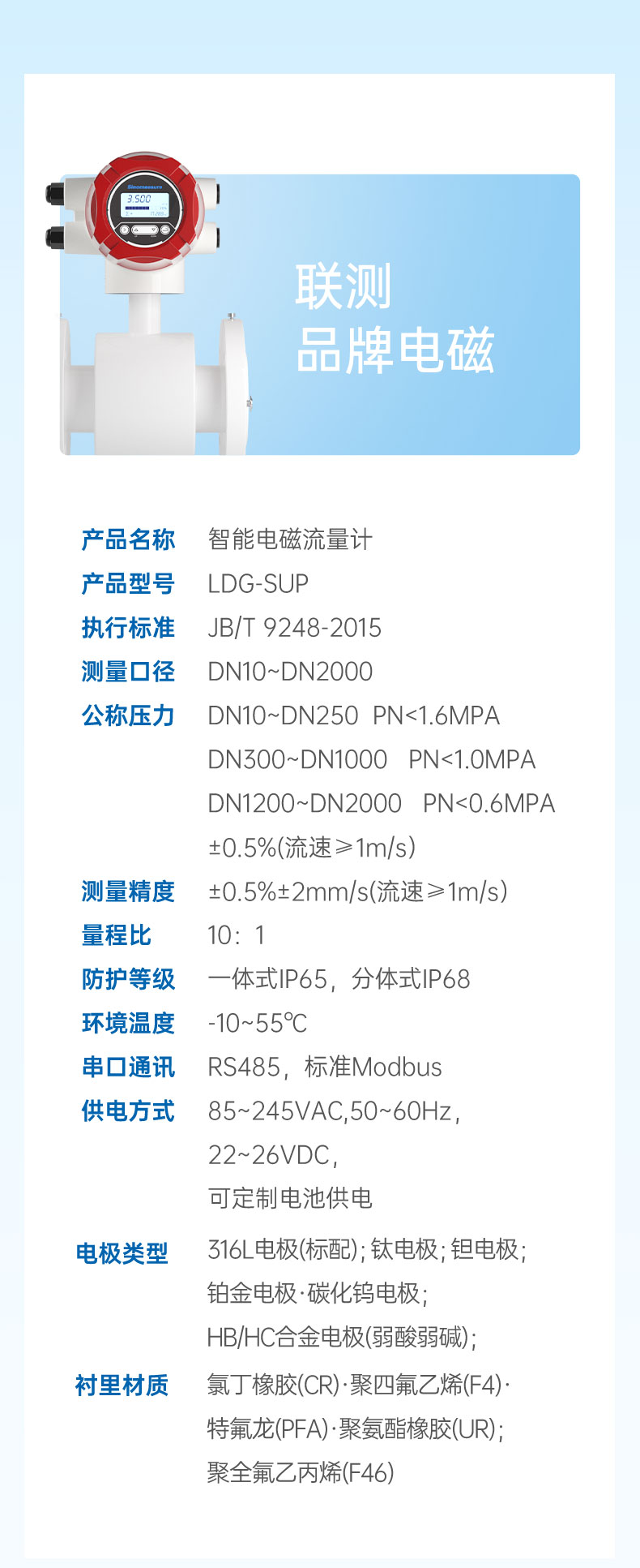 產品描述:聯測LDG電磁流量計適用于化工助劑、海綿城市、給水排水、水利灌溉、水處理、污水處理(環保污水控制、化工污水、電鍍污水)、造紙漿液(紙漿)、泥漿、醫藥原料、食品等工農業的生產公司過程流量測量和控制,標配485通訊功能。