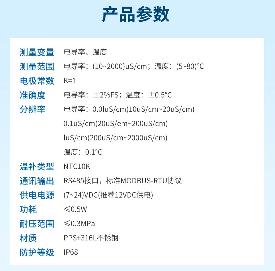 產(chǎn)品描述:電導率數(shù)字式電極采用 RS485 通訊接口和 Modbus RTU標準協(xié)議的數(shù)字式電導率傳感器,可同時測量電導率和溫度參數(shù)。本產(chǎn)品廣泛應用于生活用水、生活污水、江河湖泊、自來水、市政污水、地表水、循環(huán)冷卻水、軟化水、二次供水、泳池等場合水質(zhì)監(jiān)測。