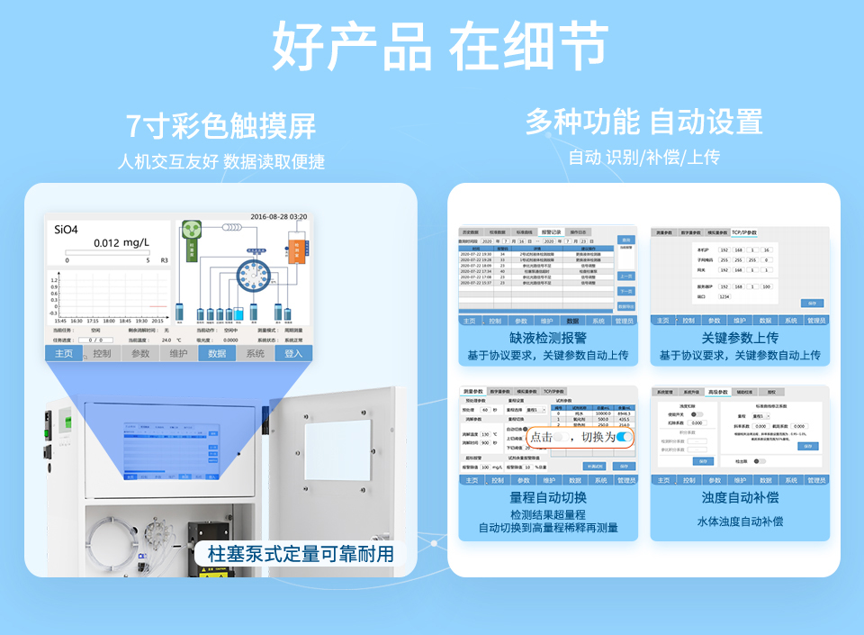 產品名稱:硅酸鹽在線水質分析試劑消耗量小、缺液檢測報警、廢液廢水分離
