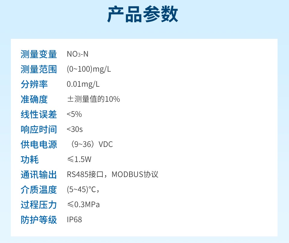 產品描述:ADI5050款硝氮電極是基于紫外光吸收法測量,一種利用紫外光譜分析技術,直接、快速、準確地測量水體中硝態氮(NO?-N)濃度的先進在線監測設備。通過校正公式消除有機物干擾,最終根據朗伯-比爾定律將計算出的凈吸光度值實時轉換為硝酸鹽氮(NO3-N)的濃度值,并通過數字信號輸出。