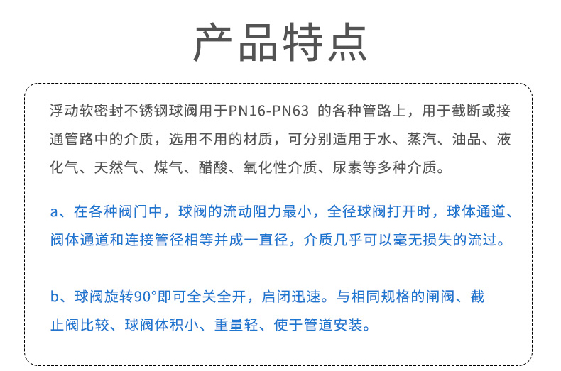 產品描述:手動球閥、閥門、閘閥、水閥、控制閥、手動閥,不銹鋼球閥用于PN16-PN63的各種管路上,用于截斷或接通管路中的介質,選用不用的材質,可分別適用于水、蒸汽、油品、液化氣、天然氣、煤氣、醋酸、氧化性介質、尿素等多種介質。咨詢熱線:400-185-1718