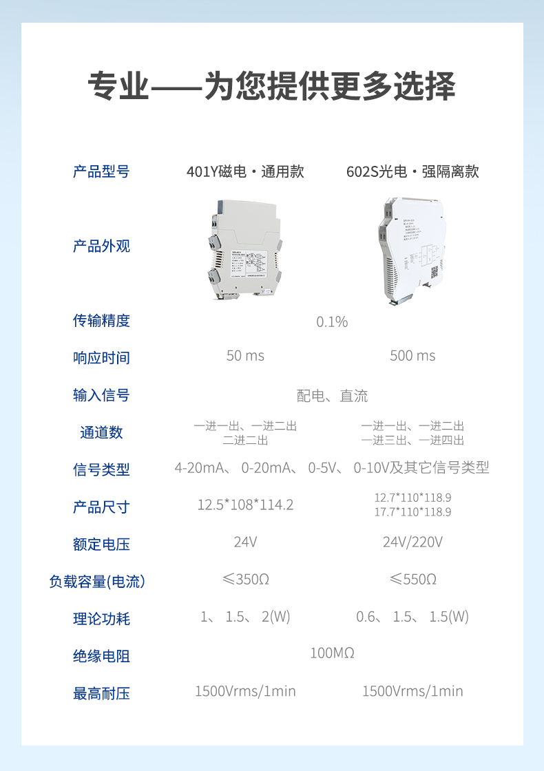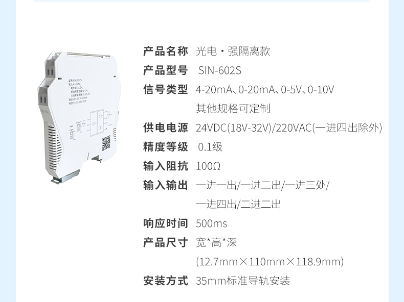 產品描述:信號隔離器是一種信號隔離裝置,將輸入單路或雙路電流或電壓信號,變送輸出隔離的單路或雙路線性的電流或電壓信號,并提高輸入、輸出、電源之間的電氣隔離性能。