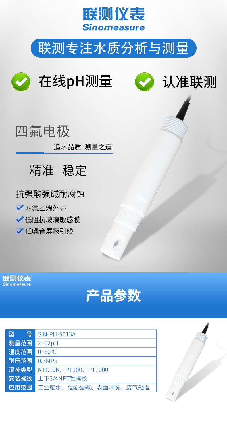 產(chǎn)品名稱:聯(lián)測_SIN-pH-5013A四氟電極_污水、廢水、酸堿液等