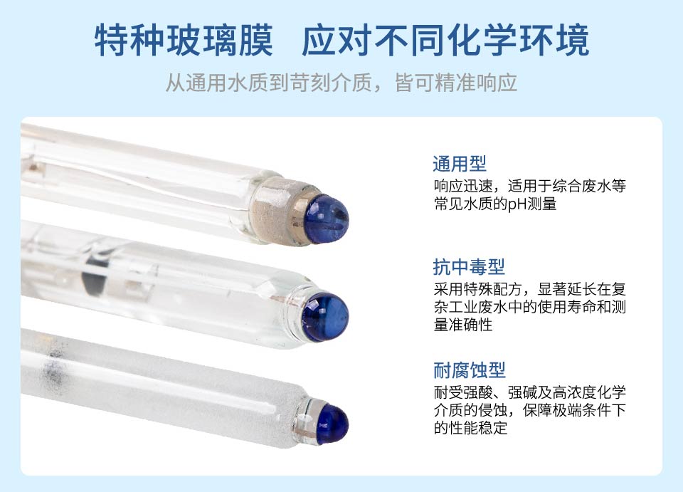 產品描述:pH 玻璃電極是由玻璃指示電極和銀/氯化銀參比電極組合在一起的復合電極,作為 pH 值測量傳感器廣泛應用于測量水溶液中的 pH 值。使用場景:特殊環境,比如化學在線、強酸強堿環境。