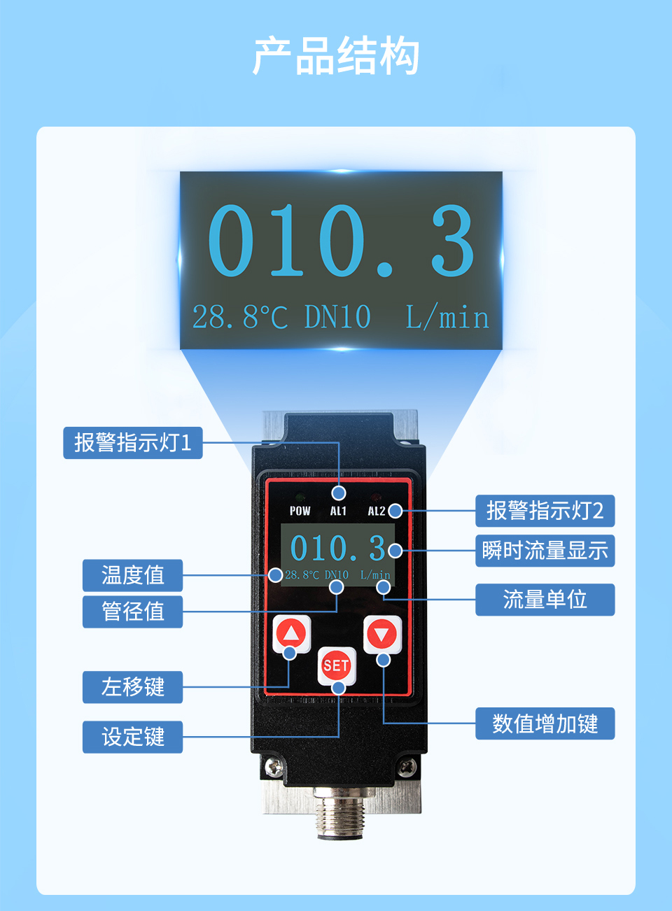 產(chǎn)品描述:微型渦輪流量計結構簡單、精確度高、安裝維修使用方便,可對管道中的液體流量及溫度情況進行實時監(jiān)控,支持流量和溫度(4~20)mA 信號或 485 通信、報警開關輸出,并采用 OLED 實時顯示流體流量及溫度,實現(xiàn)管道當中流量溫度一體式的監(jiān)控功能。本產(chǎn)品廣泛應用于石油化工、電力、治金、鋼廠、造紙、食品加工、水處理、電池廠等行業(yè)。