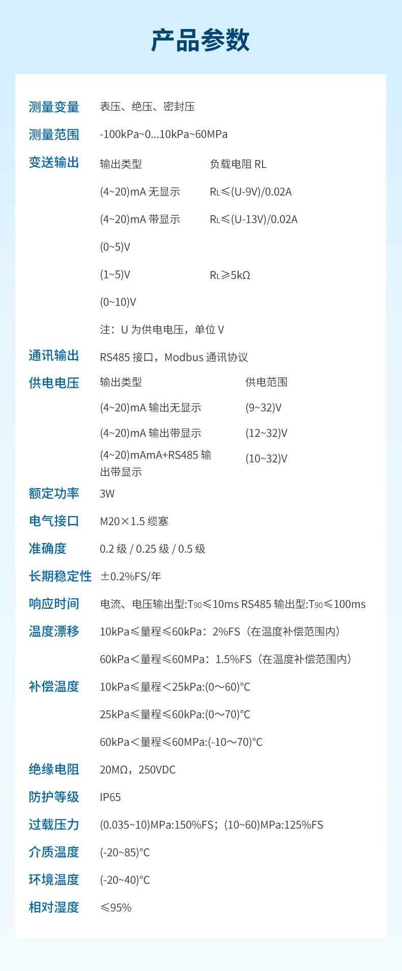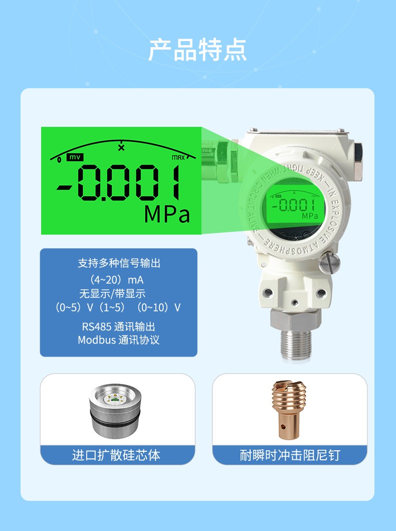 產品描述: 壓力變送器選用進口高精度、高穩定性的擴散硅芯體,傳感器內采用電子放大器組成,將測量的電信號轉換成標準信號(電流、電壓、RS485)輸出。可以直接與計算機接口卡、控制儀表、智能儀表或 PLC 等方便相連。