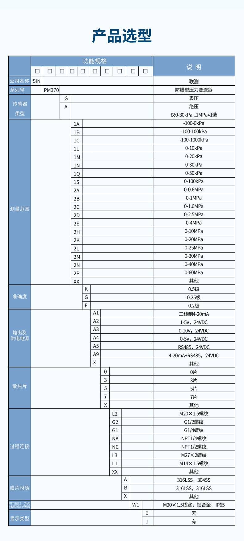 產品名稱:SIN-PM370防爆型壓力變送器/隔爆型/-100kPa-60MPa