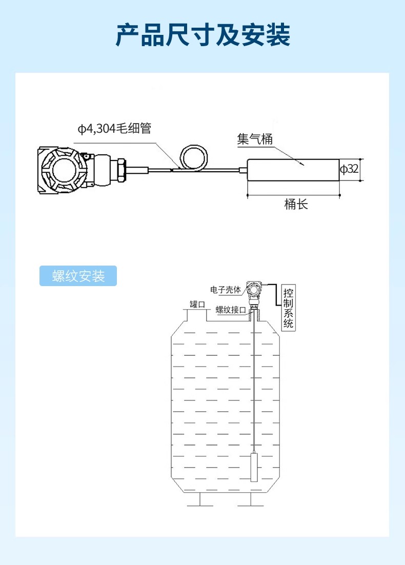 產(chǎn)品描述:集氣桶式液位變送器(下稱變送器)用于測(cè)量較高溫度液體介質(zhì)的液位,原理是被測(cè)液體介質(zhì)壓縮集氣桶內(nèi)的空氣,空氣壓力通過(guò)毛細(xì)管傳遞給敏感元件,敏感元件本身不與被測(cè)介質(zhì)直接接觸,因此變送器可以應(yīng)用在較高溫度的介質(zhì)環(huán)境中,同時(shí),內(nèi)置微型信號(hào)放大處理電路,可以直接與計(jì)算機(jī)接口卡、控制儀表、智能儀表或 PLC 等連接,進(jìn)行遠(yuǎn)程傳輸。變送器廣泛應(yīng)用于環(huán)保、水利、供水、工業(yè)過(guò)程控制、變頻供水等較高溫度介質(zhì)的液位測(cè)量。CN2