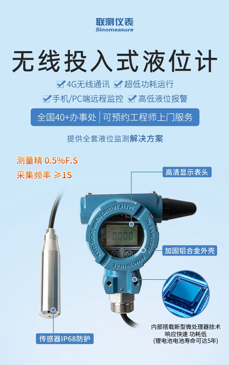 產品描述:無線投入式液位計是基于 4G 無線通訊網絡使液位的測量、變送、上報為一體的低功耗智能儀表。集成高靈敏度液位檢測元件,高精度信號調理電路,低功耗電池電源管理,豐富的 LCD 顯示界面于一體。周期性上報液位測量值、電池電量、信號質量等數據,并且能夠當液位超出設置范圍時及時報警,提前預警故障隱患。本產品適合油田、水利、消防管網、自來水管網、城市供熱管網等智慧城市應用場景。
