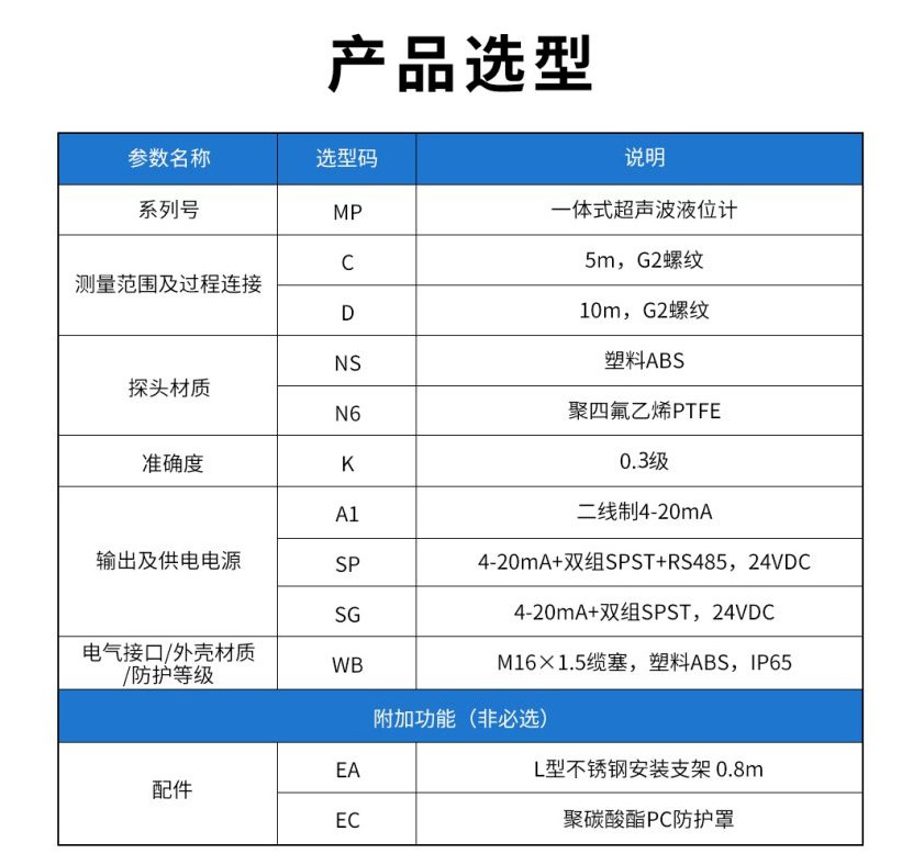 產品描述:超聲波液位計(測量液位/物位),是一種非接觸式、高可靠性、高 性價比、易安裝維護的液位/物位測量儀器。它不需接觸被測量介質就能 滿足大部分液位/物位測量要求,是本公司具有完全自主產權的新一代超聲波液位計。