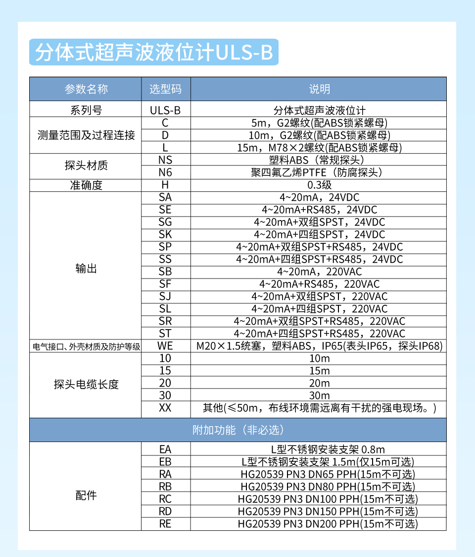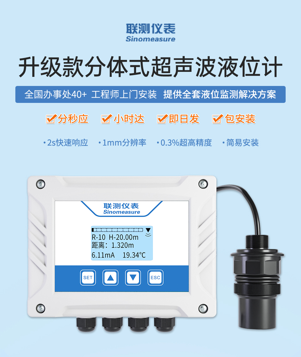 產品描述:超聲波液位計(測量液位/物位),是一種非接觸式、高可靠性、高性價比、易安裝維護的液位/物位測量儀器。它不需接觸被測量介質就能滿足大部分液位/物位測量要求,是本公司具有完全自主產權的新一代超聲波液位計。